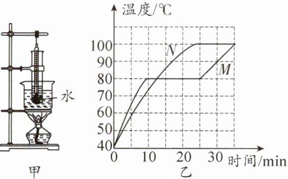 16. (2024·成都成华)用两套完全相同(如图甲所示)的装置,在一个标准大气压下,用“水浴法”分别对试管中装有少量质量相等的固体M和N进行加热,M和N的温度-时间图像如图乙所示,在35 min内M物质从固体熔化成了液体,N物质始终是固体,则下列说法正确的是( )