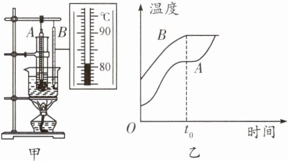 (4)图乙是温度计A、B的温度随时间变化的图像。小明观察时发现,试管内出现液体时A的示数就不再升高,当固体全部变成液体后温度再升高。此现象说明该固体是____(选填“晶体”或“非晶体”)。