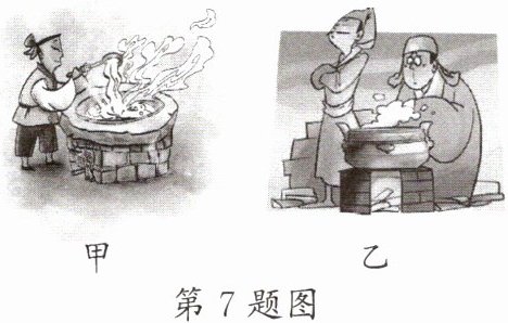 7. 如图是“扬汤止沸”和“釜底抽薪”两幅漫画。“扬汤止沸”是指把锅里沸腾的水舀起来再倒回去,是通过____(选填“升高”或“降低”)水的温度的方式止沸的;“釜底抽薪”是指从锅下抽掉燃烧着的柴薪,是通过停止给水加热,让水不能继续____的方式止沸的。
