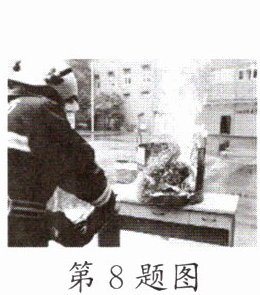 8. 近日,一段可乐能灭火的视频在网络上被疯狂转载。视频中(如图)一名男子手持一瓶可乐,剧烈摇晃后,对准旁边正在燃烧的一堆火进行猛喷,经过可乐短暂的“喷淋”后,火被扑灭了。那么,可乐到底能不能灭火?原来可乐内含有液态二氧化碳,摇晃时,会迅速____(填物态变化名称)成二氧化碳气体来达到阻燃灭火的目的,同时从周围____(选填“吸收”或“放出”)大量的热,对燃烧物起到一定的冷却作用,但灭火效果十分有限。