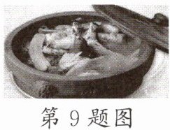9. 在中央电视台《舌尖上的中国》看到了云南名菜气锅鸡,其做法是将盛有小鸡块和佐料的气锅(如图所示)放在盛有清水的汤锅之上,再放到火上蒸。为了保持鸡肉原汁原味,主要是水蒸气通过气锅中间的气嘴将鸡蒸熟。汤汁是水蒸气____(选填“吸热”或“放热”)后____(填物态变化名称)而形成的。