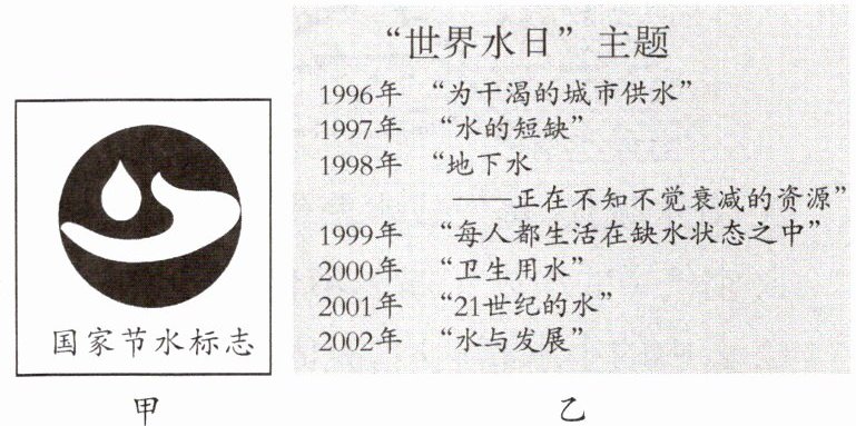 地球拥有的总水量约为$1.4×10^1^8t。$其中,含盐的海水约为$1.32×10^1^8t。$由于盐分的问题,海水不能被陆地上的生命直接作为水源来利用。地球可供陆地生命使用的淡水量不到地球总水量的千分之三,因此陆地上的淡水资源量是很紧缺的。图甲是我国节水标志,图乙是每年“世界水日”宣传主题。