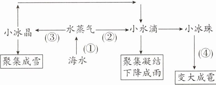 海水在阳光下蒸发变成水蒸气,这是液态变为气态的过程,属于汽化现象;水蒸气遇冷液化成小水滴,是气态变为液态的过程;水蒸气遇冷凝华成小冰晶,是气态直接变为固态的过程。