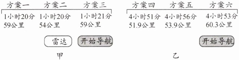(1)解:由图甲可知,方案二路程$s_1=54km$,时间$t_1=1小时20分=\frac{4}{3}h$