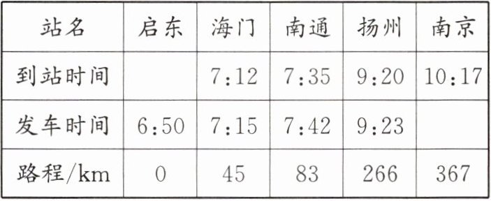 (1)由表格可知,列车7:15从海门发车,7:35到达南通,所以列车由海门到南通所用的时间$t = 7\colon 35 - 7\colon 15 = 20\min$。