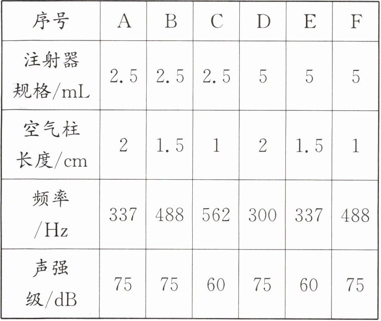 小华找来了两个未使用过的一次性注射器制成了哨子(如图所示)。注射器的规格分别为2.5 mL和5 mL。他一边吹哨子一边调整注射器内空气柱的长度,同时利用专用仪器测出声音的频率和响度,详见表。