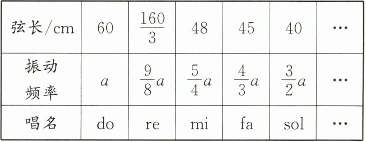 分析数据:从表格中数据可以看出,当弦长$l_1 = 60cm$时,振动频率$f_1 = a$;当弦长$l_2=\frac{160}{3}cm$时,振动频率$f_2=\frac{9}{8}a$;当弦长$l_3 = 48cm$时,振动频率$f_3=\frac{5}{4}a$等。