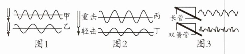 (2)对于响度,它是由发声体振动的振幅决定的,振幅越小,响度越小。观察图2中丙、丁两个波形图,可以看到丙音叉的波形振幅较大,表示重击时响度大;而丁音叉的波形振幅较小,表示轻击时响度小。