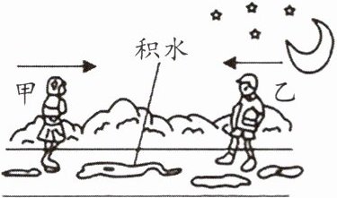 接下来,分析甲同学看到积水的水面比路面亮的原因。由于月光较暗,月光在水面上发生镜面反射,而在路面上发生漫反射。镜面反射的光线较为集中,进入甲同学眼睛的光线较多,所以甲同学看到水面比路面亮。