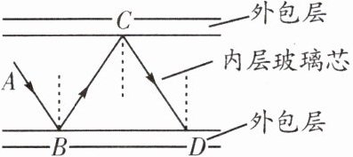 首先,根据题目描述和图示,光在玻璃纤维中传输时,每次由内层玻璃芯射向外包层的分界面时都会发生反射。这里涉及到光的反射定律,即入射角等于反射角。当增大入射光线$AB$的入射角时,由于反射定律,反射角也会相应增大。而反射光线与下一个入射点是对应的,即光线在玻璃纤维内层玻璃芯中的传播路径是连续的。因此,当入射角增大时,下一个入射点(如$D$点)的入射角也会增大。