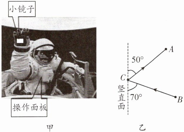 12. (2023·宜昌)航天员舱外作业时,宽厚的航天服限制了他的视野,为了看清胸前的操作面板,可以通过手腕处的小镜子(如图甲)进行观察。乙图中A点代表航天员的眼睛,B点代表胸前某一按钮,C点是小镜子的位置,请你根据反射光路图在C点准确画出镜面并标出镜面与竖直面的夹角。(保留作图痕迹)