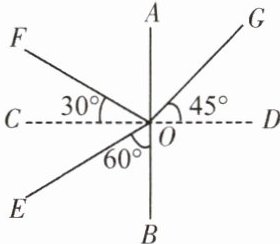 由图可知,入射角$COB$为$60^\circ$,反射角$EOB$也为$60^\circ$,折射光线$OG$与法线$AB$的夹角为$45^\circ$,由于折射角小于入射角,所以光是从空气射入玻璃,即$AB$的左侧是空气,右侧是玻璃。