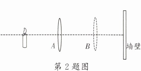 2.(2022·重庆北碚)小明在房间里进行探究凸透镜成像特点的情景如图所示。保持蜡烛的位置不变,只移动透镜,小明发现透镜在A、B两处时,墙壁上都能得到清晰的像,则两次所成的像 ( )