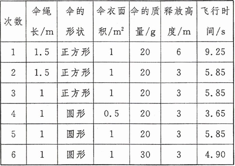 降落伞是让人或物体从空中安全降落到地面的一种工具,广泛用于应急救生、空投物资等。某 STEM 项目学习小组同学对影响降落伞飞行时间的因素产生了兴趣,并开展了以下实验。