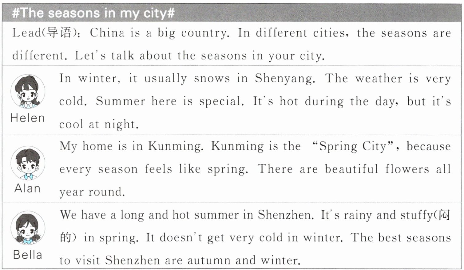 | Helen | In winter, it usually snows in Shenyang. The weather is very cold. Summer here is special. It's hot during the day, but it's cool at night. |