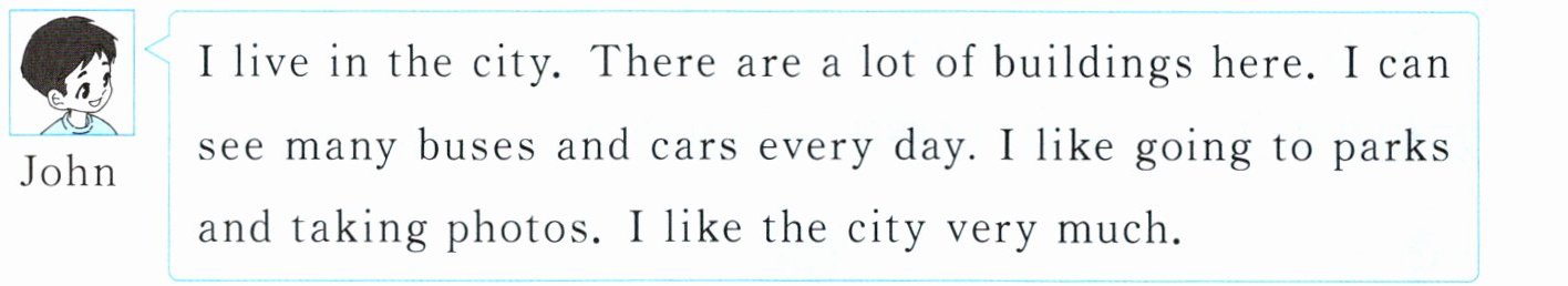 I live in the city. There are a lot of buildings here. I can see many buses and cars every day. I like going to parks and taking photos. I like the city very much. John