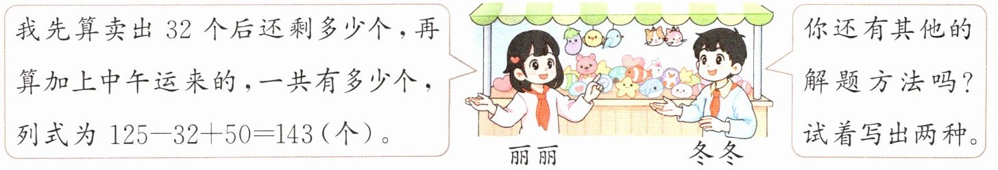 方法一 先加上中午运来的50个玩具,求出玩具的总数,再减去上午卖出的玩具数量,就是现在一共有的玩具数量。
