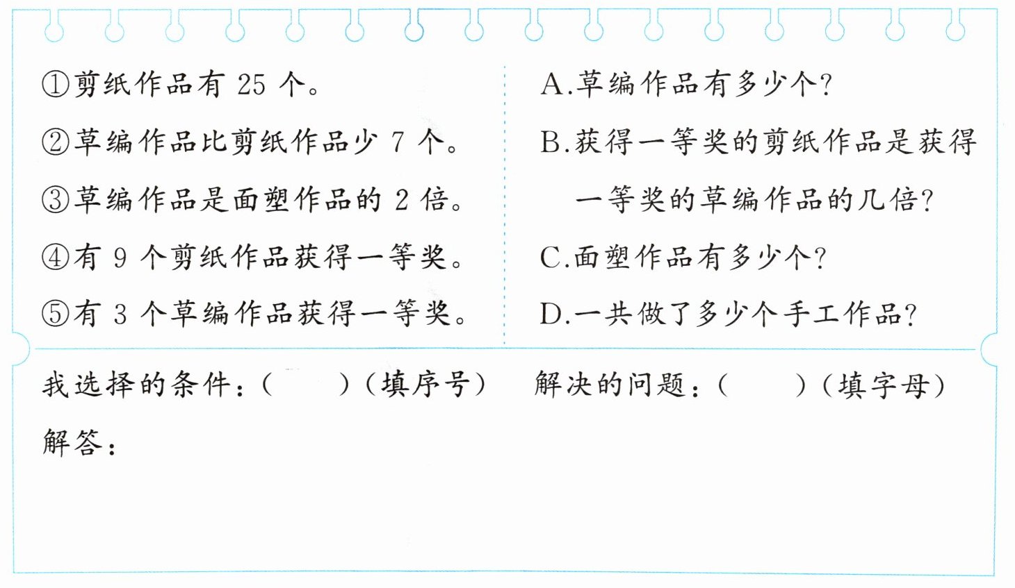 2. 手工小组做了三种手工作品。请选择合适的条件和问题组成一个数学问题,并解答。