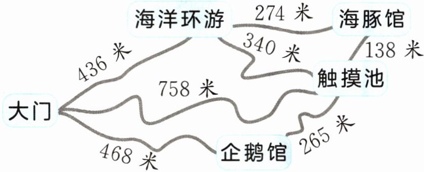 3. 妈妈带小明去参观海洋馆,从大门到触摸池走哪条路最近?