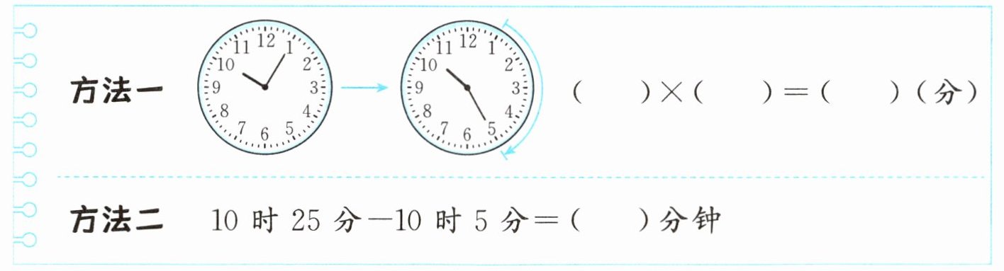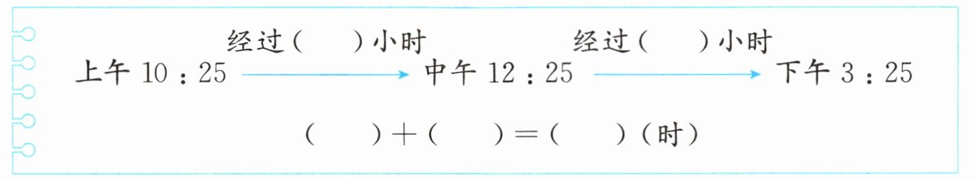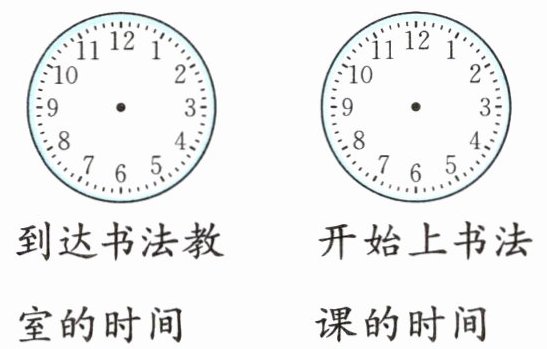小天下午 $3$ 时 $10$ 分放学后,坐地铁去上书法课,路上共用了 $20$ 分钟。到达书法教室时,距离上课时间还有 $15$ 分钟。