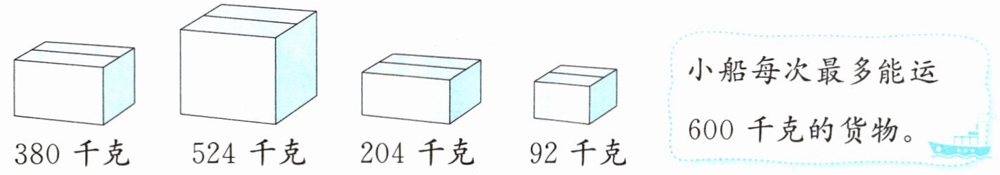 答:可以先运重524千克的箱子,再一起运重380千克和204千克的箱子,最后运重92千克的箱子。一共需要运3次。