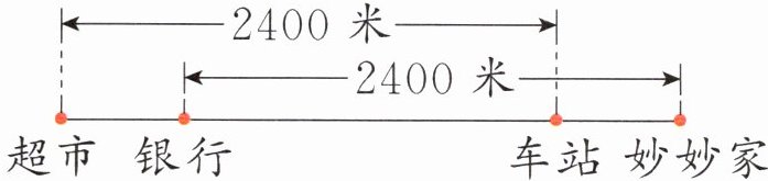 4 如图,银行和车站之间的距离是1千米800米。妙妙妈妈从超市买完东西后回家,超市距妙妙家多少千米?