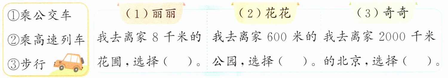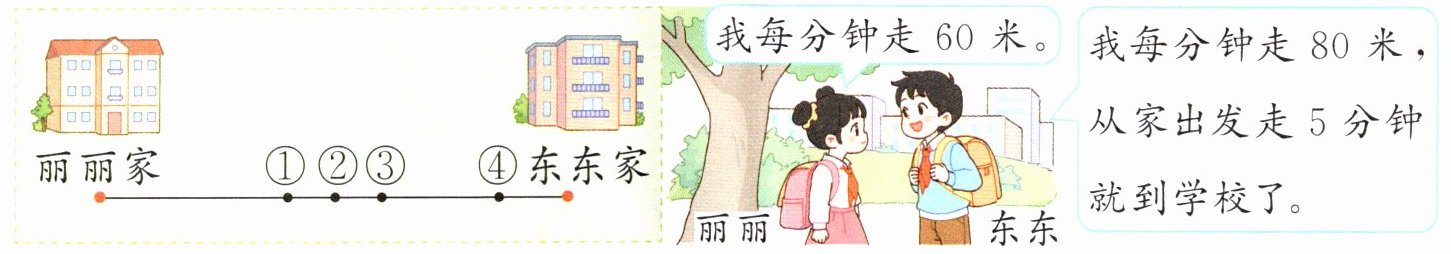 (2)丽丽家和东东家在同一条路上,两家相距1千米。学校也在这条路上,他们两家分别在学校的两侧(如下图)。学校的大概位置是( )。