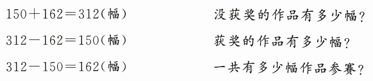 光明小学举行摄影比赛,一共有312幅作品参赛,获奖的有150幅作品,没获奖的有162幅作品。