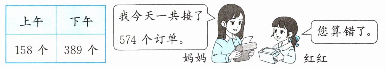 )。A.$158 < 160$,$389 < 400$,$160 + 400 = 560$(个),$158 + 389 < 574$,妈妈算多了