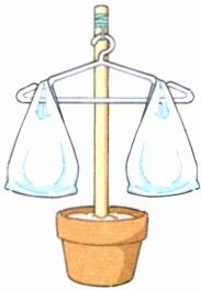用 1 个衣架、1 根木棒、1 根绳子、1 个花盆和 2 个相同的塑料袋做一个简易的天平(如右图)。天平左右两边平衡时,左右两边的物品一样重。