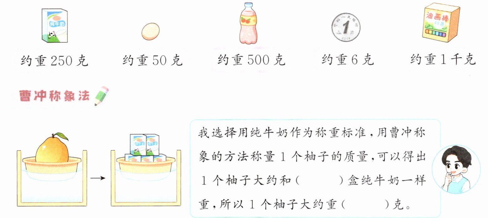 我选择用纯牛奶作为称重标准,用曹冲称象的方法称量 1 个柚子的质量,可以得出 1 个柚子大约和( )盒纯牛奶一样重,所以 1 个柚子大约重( )克。