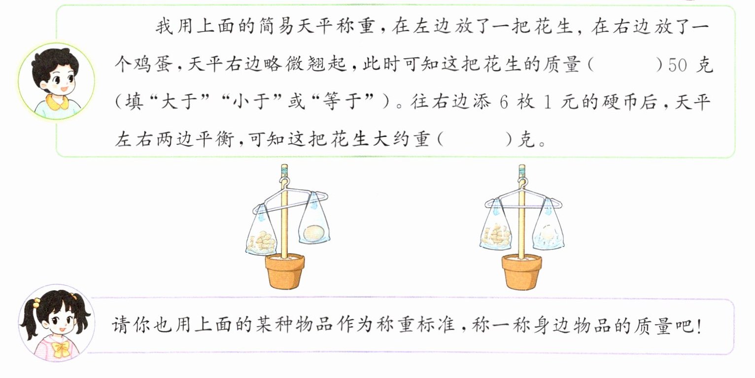 解析 天平右边略微翘起,说明左边花生的质量大于右边1个鸡蛋的质量(50克),即这把花生的质量大于50克。往右边添6枚1元的硬币后,天平左右两边平衡,所以这把花生的质量=1个鸡蛋的质量+6枚硬币的质量,这把花生大约重50+6×6=86(克)。