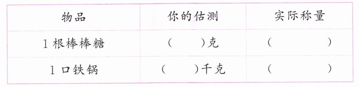 10 8克 2 2千克(答案不唯一,根据实际情况填写)解析 棒棒糖是比较小且轻的物品。根据生活经验,1根棒棒糖大约重10克。使用合适的秤(如天平)对1根棒棒糖进行称量,得出实际质量为8克。根据我们平时的生活经验,一口铁锅大约重2千克。用秤实际称量一口铁锅,得到其质量为2千克。