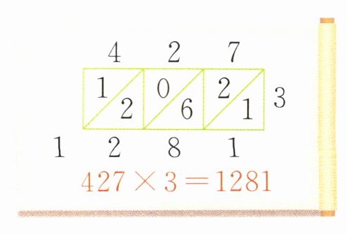 ,把365写在3个正方形上面,4写在3个正方形右面,4×5=20,20写在5下面的正方形中,4×6=24,24写在6下面的正方形中,4×3=12,12写在3下面的正方形中,再把它们沿斜线分别相加,相加的结果从左往右依次排列就是最后的积。