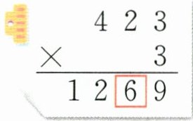 (2)买$423$本练习本,每本$3$元。竖式计算如右图,竖式里的$6$表示( )。