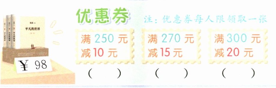 购买前李老师应该领取哪张优惠券?在合适的优惠券下面画“√”。