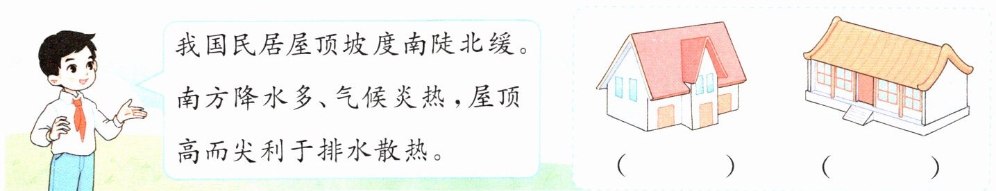 解析 第一步 判断题图中的两座房屋属于南方地区还是北方地区。 南方房屋屋顶高而尖,坡度较陡,第一个房屋符合;北方屋顶坡度较缓,第二个房屋符合。 第二步 判断奶奶家和姑姑家所在的省份属于南方地区还是北方地区。 河北属于北方地区,湖南属于南方地区。 因此题图中的第一个房屋是湖南的姑姑家,第二个房屋是河北的奶奶家。