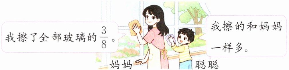 (1)$\frac{3}{8}+\frac{3}{8}=\frac{6}{8}$ 答:妈妈和聪聪一共擦了全部玻璃的$\frac{6}{8}$。 解析 聪聪擦的和妈妈一样多,所以聪聪也擦了全部玻璃的$\frac{3}{8}$。求妈妈和聪聪一共擦了全部玻璃的几分之几,用加法计算。