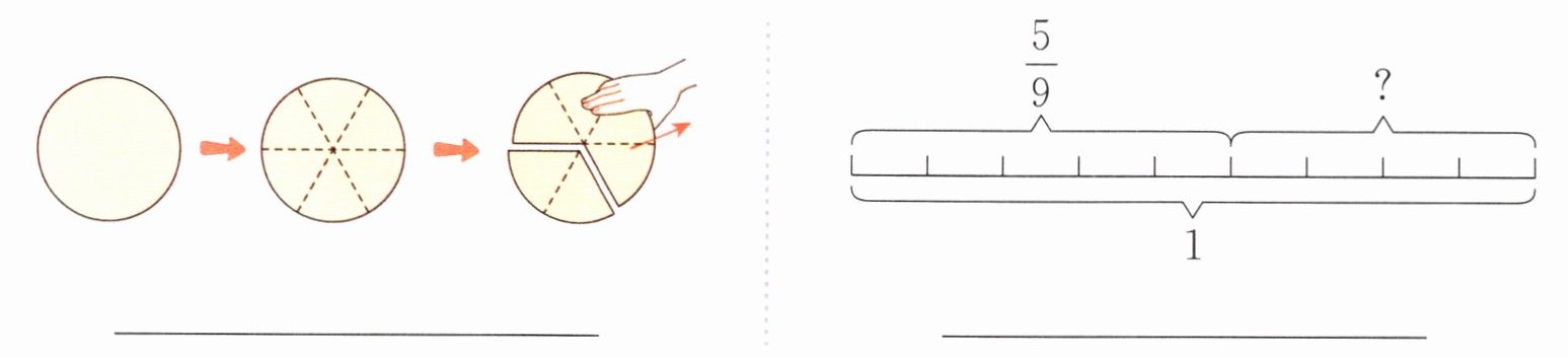 $1-\frac{4}{6}=\frac{2}{6}$ $1-\frac{5}{9}=\frac{4}{9}$ 解析 第一道题:把圆看作“1”,平均分成 6 份,每份是$\frac{1}{6}$。“1”就是$\frac{6}{6}$,拿走了 4 份,是$\frac{4}{6}$,还剩下 2 份,是$\frac{2}{6}$。 第二道题:根据线段图列式为$1-\frac{5}{9}$,把 1 看成 9 个$\frac{1}{9}$,即$\frac{9}{9}$,从$\frac{9}{9}$里减去$\frac{5}{9}$,剩下$\frac{4}{9}$。