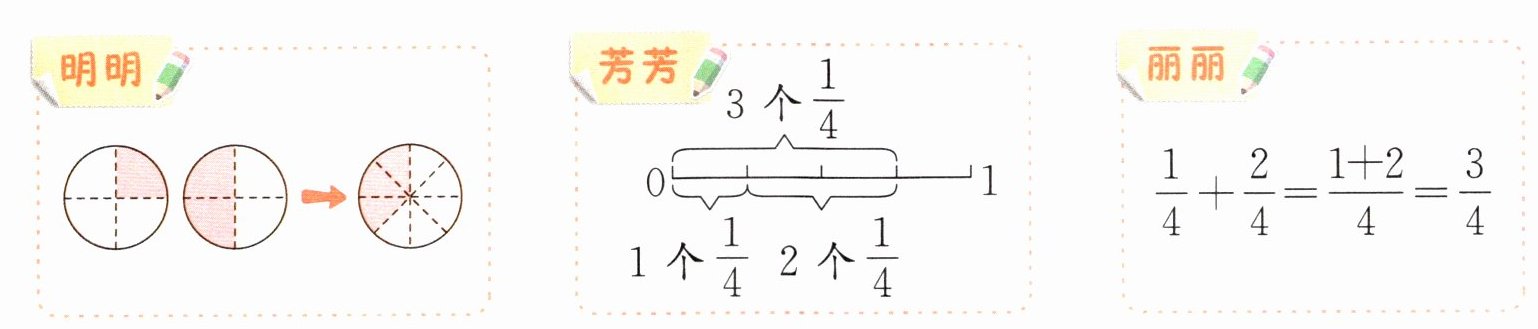 2 下面是三位同学计算$ \frac { 1 } { 4 } + \frac { 2 } { 4 } $的想法,其中正确的有( )。