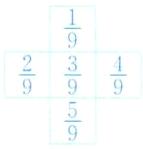 5 把$ \frac { 1 } { 9 } 、 \frac { 2 } { 9 } 、 \frac { 3 } { 9 } 、 \frac { 4 } { 9 } 、 \frac { 5 } { 9 } $这五个分数分别填入右面的方格中,使横行、竖列三个数的和相等。