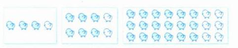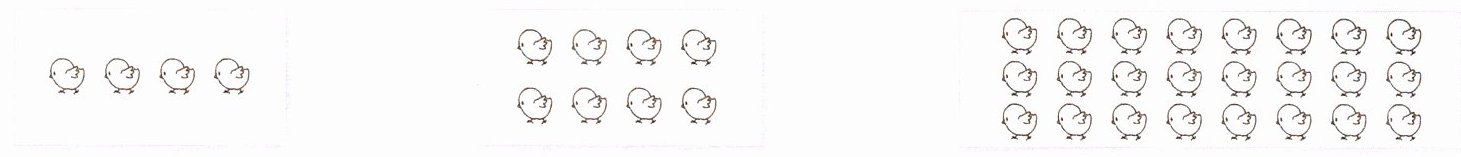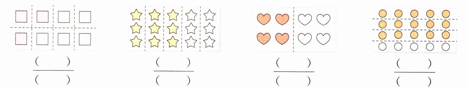 我发现:每幅图中的小鸡都被平均分成了( )份,涂了其中的( )份,涂色部分都表示每幅图中小鸡总数的( )。