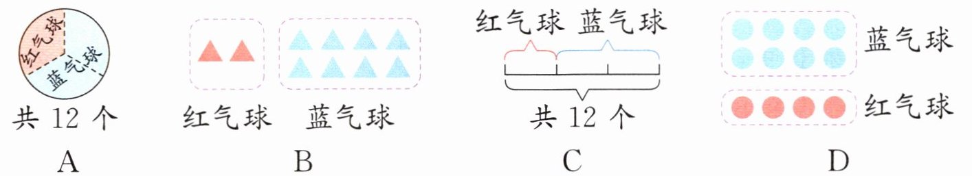 (1)有 12 个气球,其中$\frac{1}{3}$是红气球,$\frac{2}{3}$是蓝气球。下面表示错误的是( )。