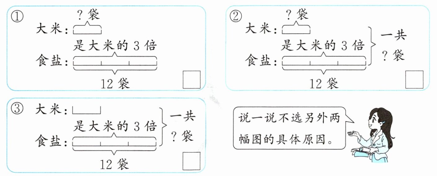 先选出能将上面信息和问题表示完整的图,在$□$里画“√”,再列式解答。