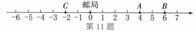 11. (2024·邳州期中)邮递员骑车从邮局出发,先向东骑行$4km$到达$A$村,继续向东骑行$2km$到达$B$村,然后向西骑行$8km$到达$C$村,最后回到邮局。