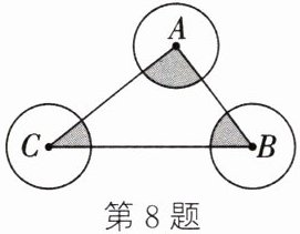8. 如图,以三角形各顶点为圆心,2 为半径画圆,则图中三个扇形区域(即涂色部分)的面积之和为