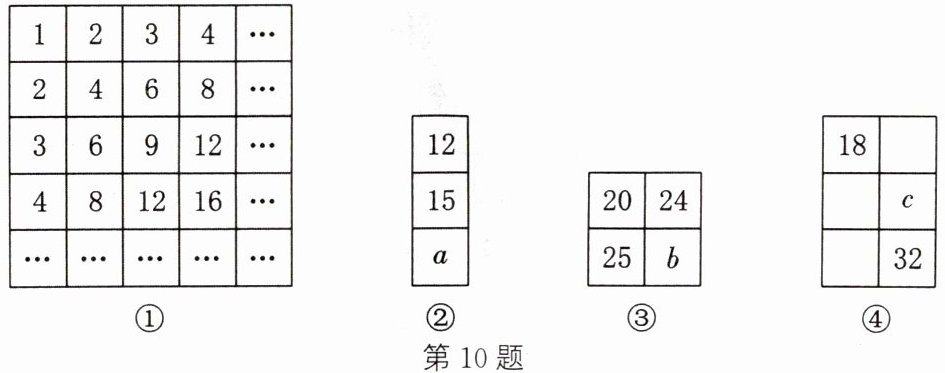 10. 18 30 28 解析:由题图①,可知第1列中,从第2行开始,每个数都比上一个数大1;第2列中,从第2行开始,每个数都比上一个数大2;第3列中,从第2行开始,每个数都比上一个数大3,...,以此类推.再看行,第1行中,从第2列开始,每个数都比前一个数大1;第2行中,从第2列开始,每个数都比前一个数大2;第3行中,从第2列开始,每个数都比前一个数大3,...,以此类推.根据这个规律,由题图②,得15−12=a−15,解得a=18.题图③中,因为24−20=4,所以20与24在第4行,则25与b在第5行.所以b=25+5=30.这个规律也可以理解为每个数是它所在行数与列数的乘积,题图④中,18=1×18=18×1=2×9=9×2=3×6=6×3,另外一个已知数32所在位置比18多1列,多2行,可以推出c在第4列,第7行,所以c=28.综上所述,a=18,b=30,c=28.