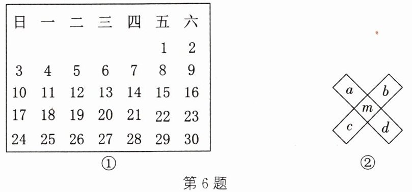 6. (2025·丰县期中)月历中蕴藏着有趣的数学规律.如图①所示为 2024 年 11 月的月历,用笔在月历中任意框出两组呈对角线交叉的 5 个数.若在月历中用笔框中的五个数分别表示为 $a,b,c,d,m$(如图②),且 $a + b + c + d = 76$,则 $m$ 的值为(