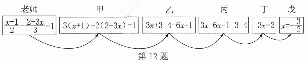 12. 综合实践课上,同学们玩“接力游戏”,由每组学生合作解一元一次方程.如图,老师将题目交给甲同学,他完成一步解答后交给乙同学,依次进行,最后由戊同学完成求解.规则是每人只能看到前一人传过来的式子.