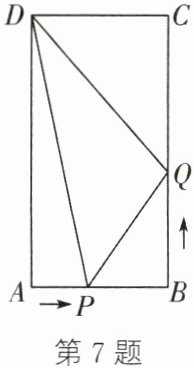 7. $\because6÷1 = 6(s)$,$12÷2 = 6(s)$,$\therefore0<t<6$ 根据题意,得$(6 - t)^{2}+(2t)^{2}+(12 - 2t)^{2}+6^{2}=12^{2}+t^{2}$ 整理,得$2t^{2}-$$15t + 18 = 0$,解得$t_{1}=\frac{3}{2}$,$t_{2}=6$(不合题意,舍去) $\therefore$当$t$的值为$\frac{3}{2}$时,$\triangle PQD$是以PD为斜边的直角三角形